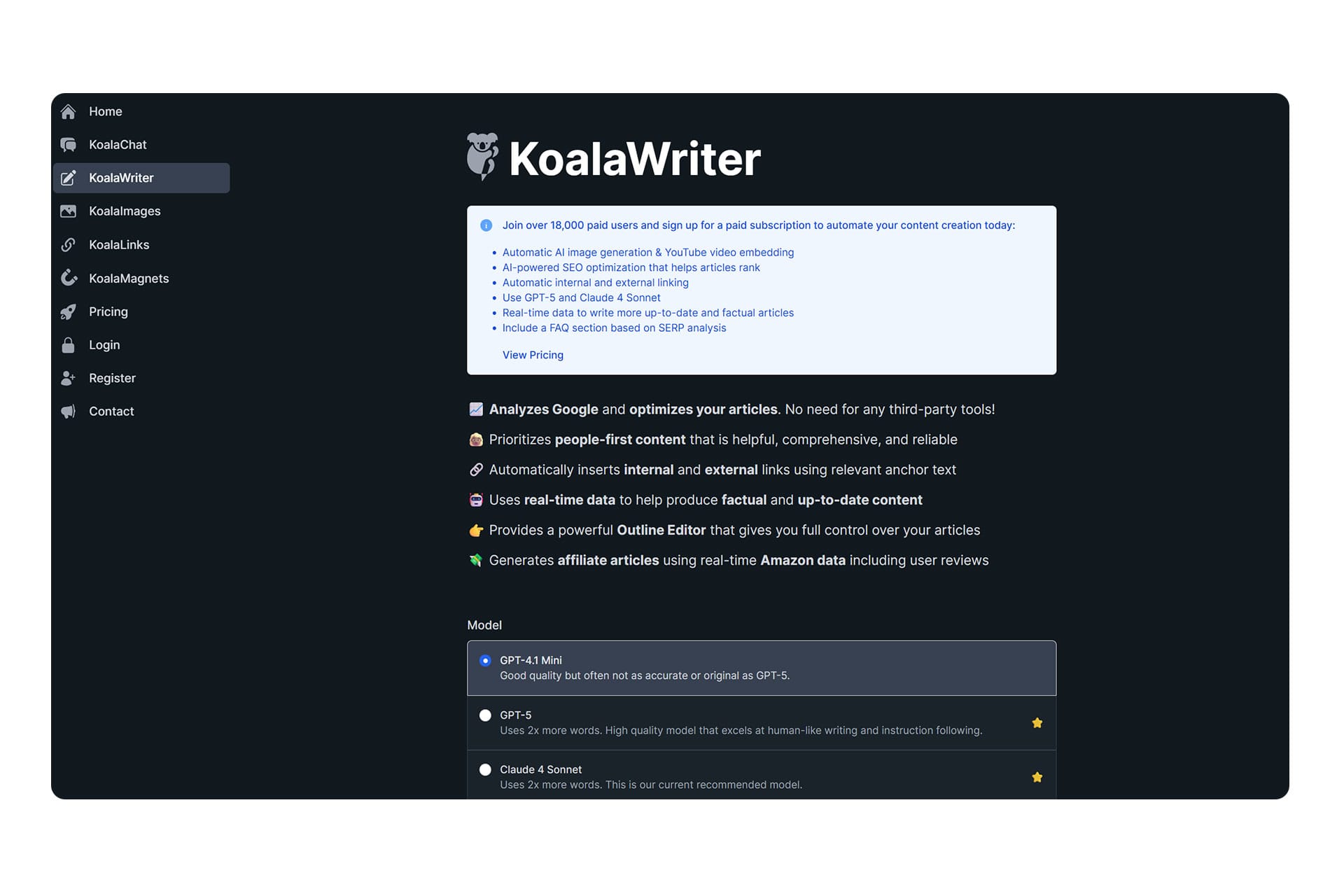 One of its standout features is the ability to automatically build internal links within the content it creates by referencing your entire website. It can also connect directly to your site and publish articles for you, which saves a ton of time. For anyone serious about creating long-form content for a website, Koala Writer is a top choice. For a deeper dive, read my full review of KoalaWriter.