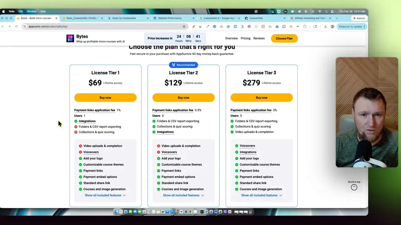 The missing features on Tier 1 are not minor — no voiceovers, no video uploads, no CSV exports, and no quiz scoring. Those are core to making a course feel professional. If this becomes a revenue stream for you, the one-time spend on Tier 3 pays for itself fast. That's the whole appeal of lifetime deals — no recurring monthly fees eating into your margins.
