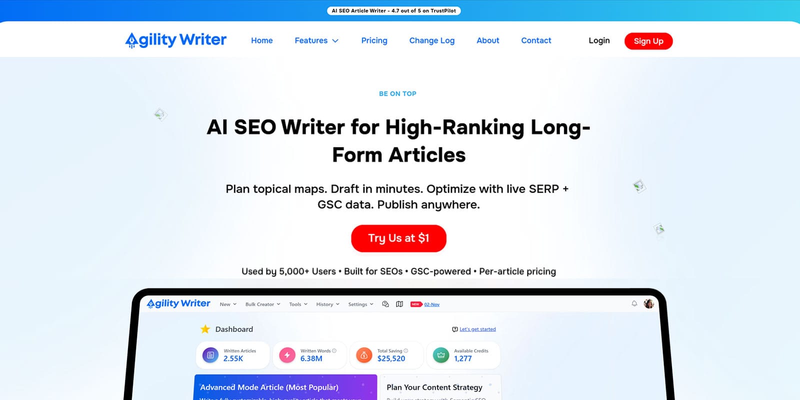 Agility Writer is really fun to use. The UI/UX is super simple. With help icons at every step, ability to do factual updated roundup posts, high quality, extremely well-formatted content that looks like it took a human hours to write. You can also publish to your WordPress directly inside Agility. This writer is developed by and SEO that knows what he is doing and what is essential. He adds new features weekly. His latest feature is automatically adding external links inside each piece of content. A fantastic software.