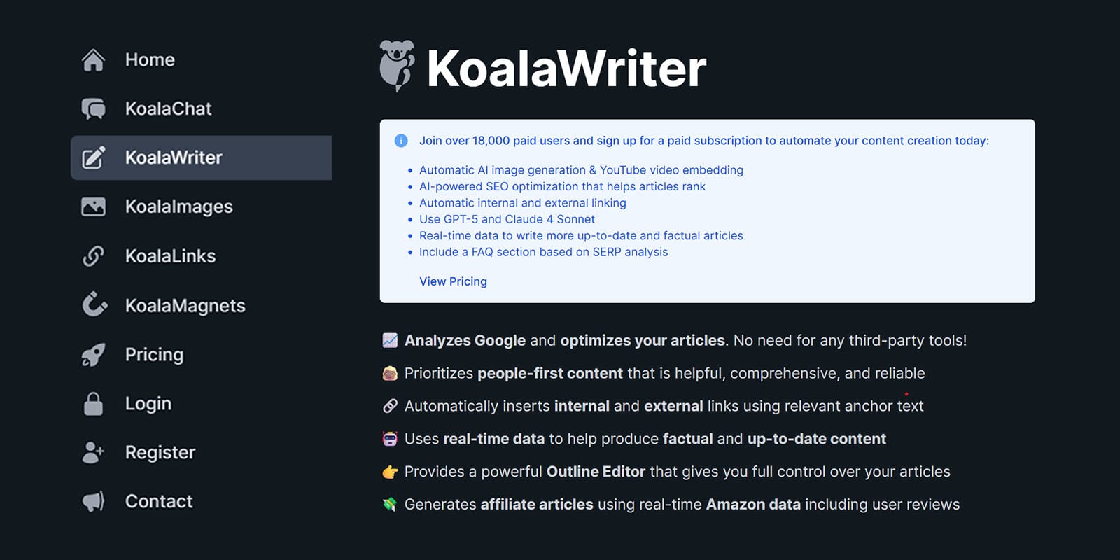 An SEO expert and successful blogger developed Koala with multiple blogs. Koala follows the process that Koala creator follows to create successful blog posts and roundup posts and rank them on Google. This writer makes it easy to connect to your WordPress CRM and create massive amounts of content quickly that are well researched, live scraped, and factual base content. Use the code DAVIDMILLS to get 15% off.