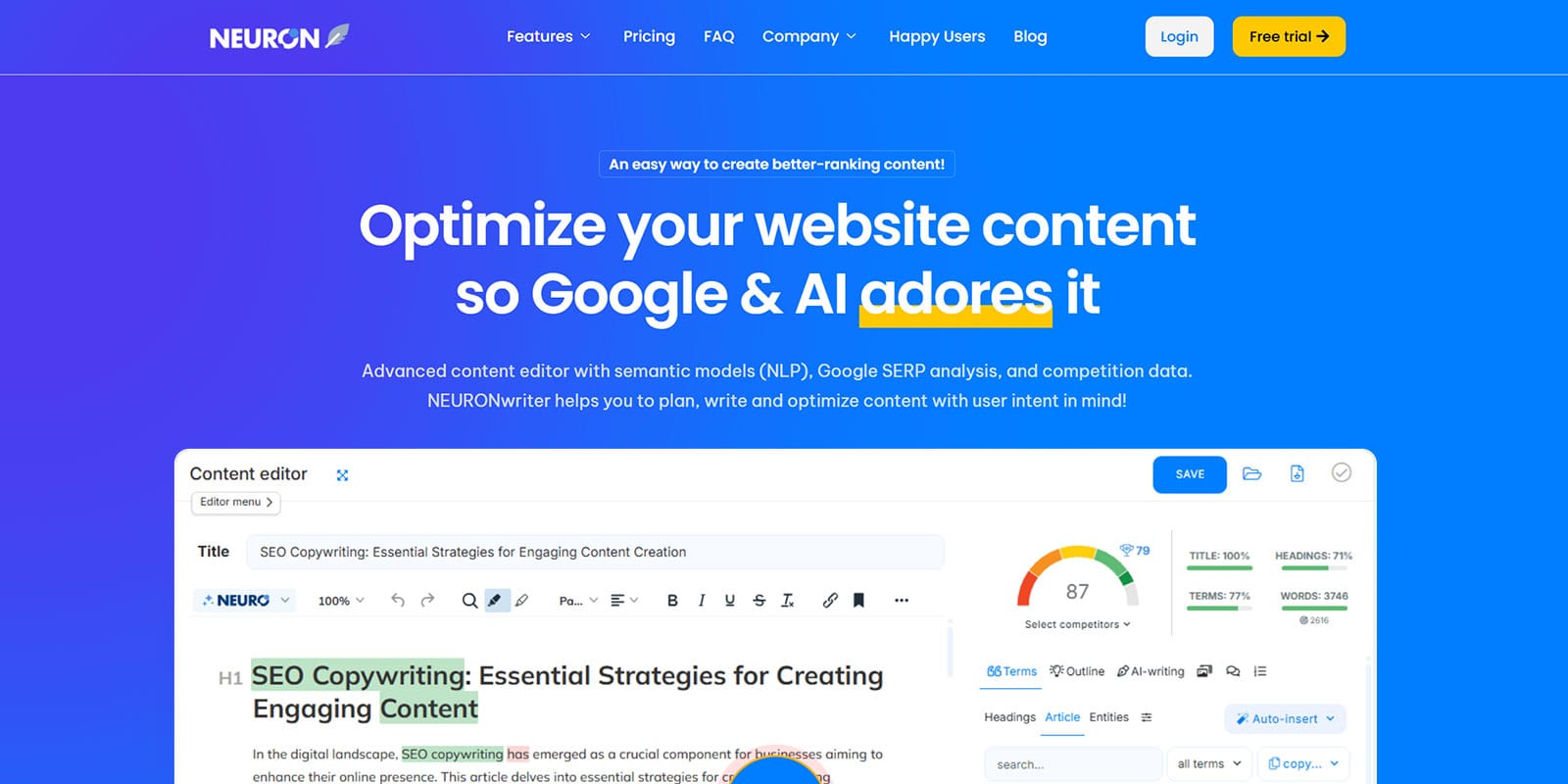 If you are looking for a Surfer SEO or Frase alternative, then Neuronwriter is your best choice. It has a ton of SEO features built in. At the moment it is offered as an LTD on Appsumo so go get your copy now!